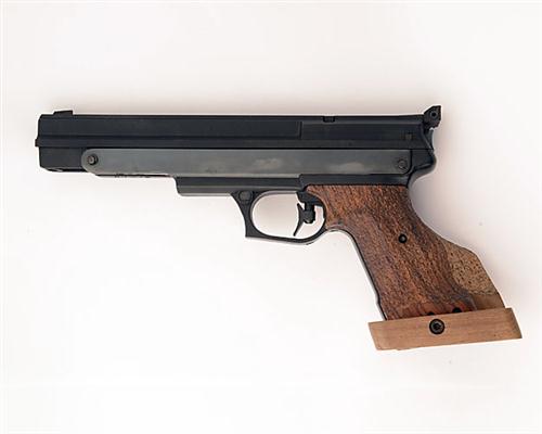 A .177 SINGLE-STROKE PNEUMATIC TARGET AIR-PISTOL SIGNED GAMO, MODEL 'COMPACT', serial no. 0396697, with concealed 8 1/2in. barrel, kevlar shroud with micro-adjustable sights, kevlar receiver with blued steel reinforcing plates, stippled walnut left-hand grip