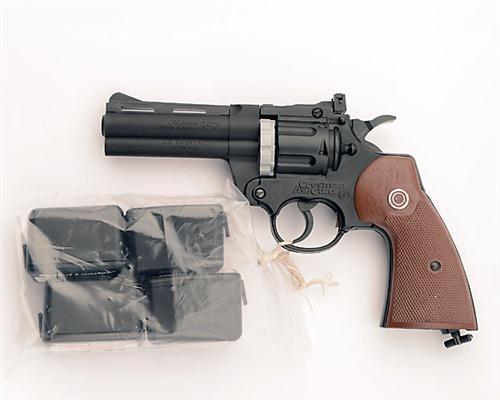 A .177 CO2 POWERED REVOLVING AIR-PISTOL SIGNED CROSMAN, MODEL 357, serial no. 296801155, with 4in. barrel, in loose imitation of a 'Colt Python', black diecast and plastic construction, with chequered plastic grips and including 12 'Speedloader' magazines in their makers boxes for the same pistol