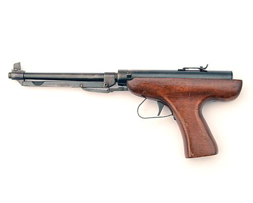 A SCARCE .177 UNDER-LEVER AIR-PISTOL SIGNED FOREIGN, no visible serial number, produced by Relum of Hungary circa 1966, with sighted 7 1/2in. barrel, swing open loading tap, one-piece wood stock and blued under-lever