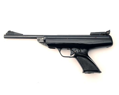 A BOXED .177 BREAK-BARREL AIR-PISTOL SIGNED BSA, MODEL 'SCORPION', serial no. A46682, circa 1989, with 8in. barrel, detachable cocking aid, adjustable sights, blued air-chamber, one-piece chequered black plastic stock and complete with its makers card and polystyrene carton (worn)