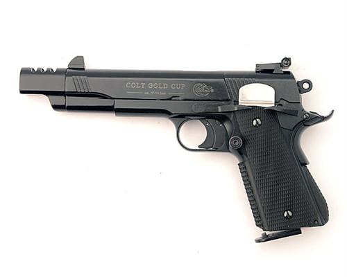 A CASED .177 CO2-POWERED REPEATING AIR-PISTOL SIGNED COLT, MODEL 'GOLD CUP', serial no. F7473024, recent, with 6 1/2in. barrel including built-on compensator, adjustable sights, ambidextrous safety, extended beaver-tail, soft plastic chequered grips, in its manufacturers abs plastic carry case with spare magazines, the whole appearing little used