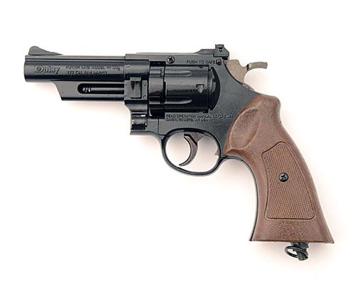 A BOXED .177 CO2-POWERED REPEATING AIR-PISTOL SIGNED DAISY, MODEL '444', serial no. 069513134, recent, in loose imitation of a Smith & Wesson .44 magnum with a 4in. barrel, adjustable sights, black painted finish and chequered wood-grain effect plastic grips, complete with its makers carton and spare magazines, the whole appearing little used