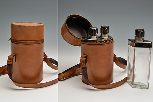 A CYLINDRICAL LEATHER CASED SET OF THREE METAL AND GLASS DRINKS FLASKS
