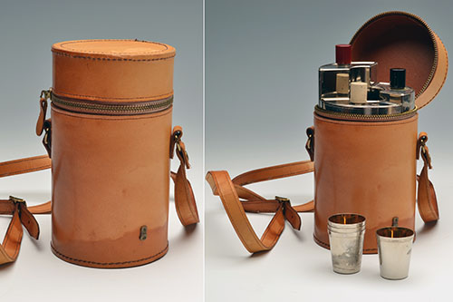 A LEATHER CASED DRINKS SET cylindrical leather zip case with three 13oz. tin-lined screw top flasks with different coloured caps and four tots, external measurements approx. 7in. height, 4 1/8in. diameter, leather shoulder strap
