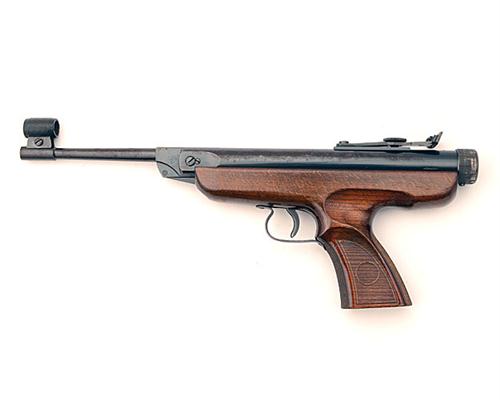 A .22 BREAK-BARREL AIR-PISTOL SIGNED ORIGINAL, MODEL '5', no visible serial number, made between 1958-60, with tapering 7in. barrel, hooded fore-sight, adjustable rear-sight, blued cylinder, wood right-hand grip (some corrosion to blued finish)