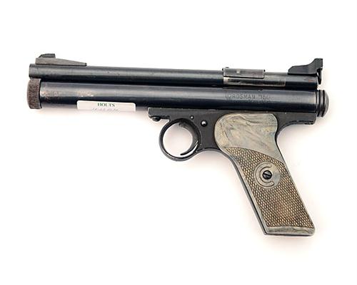 A .22 CO2-POWERED AIR-PISTOL SIGNED CROSMAN, MODEL '150', serial no. 57246, circa 1957, first series second variant with blued bull-barrel, blued air-chamber. adjustable sights and mottled grey chequered plastic grips