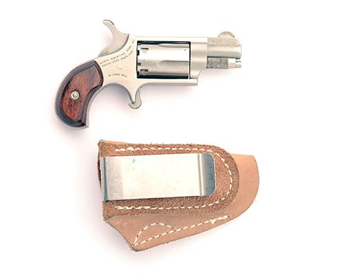 ** A .22 (L/R) FIVE-SHOT MINI-REVOLVER SIGNED NORTH AMERICAN ARMS, serial no. G59458 recent, with 1 1/8in. sighted barrel, stainless steel fluted cylinder, single action frame with spur-trigger and wood birdshead grips, complete with a leather belt holster