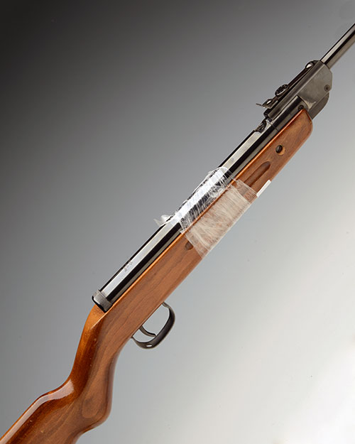 ** A .177 (B/B) BREAK-BARREL AIR-RIFLE SIGNED WALTHER, MODEL '54MG', serial no. 056185, made only in 1954, with blued 17 3/4in. sighted barrel, detachable 6-shot rotary magazine (glass viewing window broken), plain air-chamber, beech half-stock, much original finish