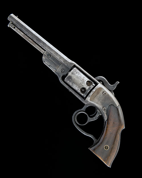 circa 1863, with 7in. octagonal barrel, bead fore-sight, standing notch rear-sight, the top-strap signed 'SAVAGE R.F.A. CO. MIDDLETOWN CT, H.S. NORTH PATENTED JUNE 17 1856, JANUARY 18 1859, May 15 1860', off-set central hammer, plain cylinder with ratchet indexing, heavy iron frame with side-plate, possible replacement gum-wood grips, oversized trigger-guard with single action trigger-blade and additional ring cocking trigger, hinged under-barrel rammer, the whole cleaned with some shallow pitting throughout.
