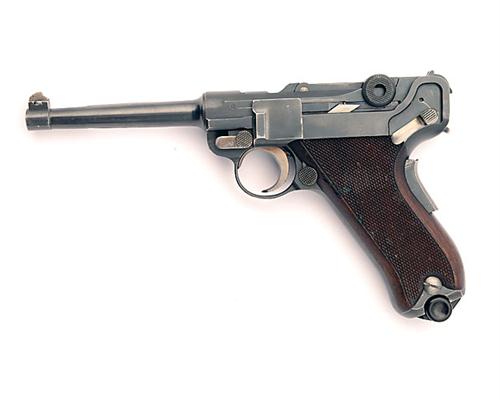 ** A 7.65mm PARA (.30 LUGER) SEMI-AUTOMATIC SERVICE PISTOL SIGNED WAFFENFABRIK BERN, MODEL 'SWISS 06 W+F LUGER', serial no. 21238, for 1923, with 4 3/4in. sighted barrel, blued receiver, blued toggle with knurled cocking-pieces, the top stamped with a Swiss cross over 'WAFFENFABRIK BERN', blued frame with grip-safety, chequered walnut grips, much original finish remaining including 'straw' to the ancilliaries, COMPLETE WITH its leather service issue holster