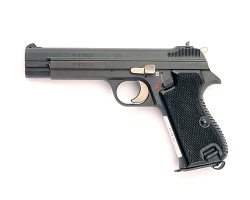 ** A 7.65mm PARA (.30 LUGER) SEMI-AUTOMATIC SERVICE PISTOL SIGNED SIG, MODEL 'P210', serial no. P87058, circa 1980, with 4 1/2in. barrel, blacked sighted slide, blacked frame, the right hand side engraved 'F STAMPFLI WAFFEN LUZERN', black plastic chequered grips and heel magazine release, appearing little used