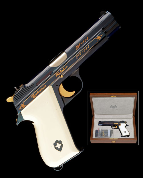 made in 1991, with 4 1/2in. barrel, 'peacock' blue finish to slide and frame, the right-hand side with a gilt-border panel inscribed 'CONFEDERATIO HELVETICA No 1364', the left with two panels either side of the Swiss shield device inscribed '1291' and '1991' respectively, the gilded letters 'C.H.' forwards of the rear-sight, the gilded 'SIG' trademark on the beaver-tail, gilt safe position markers, gilded trigger, slide release, safety catch and hammer and white smooth ivorine grips with blue inlet Swiss shields, the whole appearing unused, TOGETHER WITH its presentation walnut case, lined in the continental manner in grey suede with printed 'SIG' logo to the inside of lid, the shaped compartment for the pistol bearing a leather label stating the model details and manufacturer
