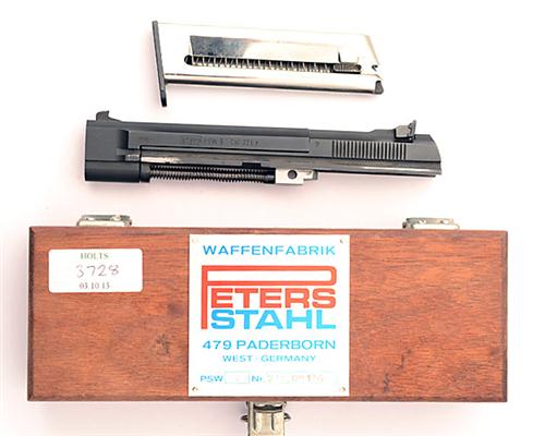 ** A .22(L/R) SEMI-AUTOMATIC CONVERSION KIT FOR A SIG 210 SEMI-AUTOMATIC PISTOL SIGNED PETERS STAHL, serial no. 210.00126, comprising blued replacement slide, barrel and polished stainless-steel magazine, complete with its fitted wood box bearing a 'PETERS STAHL' aluminium trade plaque