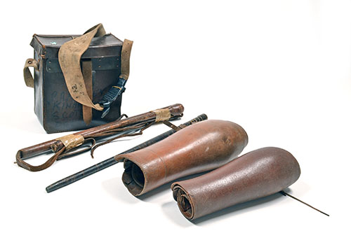 A COLLECTION OF OUTDOOR ITEMS, including 2 x vintage leather gaiters, leather cartridge box, 2 x horse whips, seargents stick