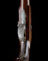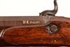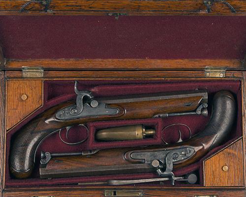circa 1800 and converted from flint by drum and nipple, with octagonal twist 7in. barrels, the top-flats engraved 'LONDON', bead fore-sights, standing notch rear-sights to the hooked breeches, border engraved breech-ends, the South African registration numbers engraved in script to the left hand flats near breech, engraved top-tangs, slightly curved bevel-edged border engraved rounded step-tailed lockplates signed 'CLARK', sliding safes behind the scroll engraved hammers, walnut full-stocks with chequered bag-shaped butts, rectangular silver escutcheons engraved with an 'AAB' monogram, border and scroll engraved iron trigger-guard bows with pineapple finials, captive iron stirrup swivel ramrods (one pistol with loss to wood along leading edge of fore-end) COMPLETE WITH their original oak storage case, re-stained and re-lined in burgundy baize, compartmented in the English manner and retaining a bag-shaped flask, bullet mould and the tip of the original wood rammer, the lid of case with flush-folding rectangular handle and pointed escutcheon engraved 'MR H. BAGSHAWE'