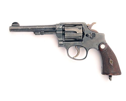 A .38 (S&W) SIX-SHOT DOUBLE-ACTION REVOLVER SIGNED SMITH & WESSON, MODEL 'M&P' serial no. 799180, with 5in. barrel, chequered walnut grips, case-hardened hammer and trigger, possibly original finish with surface scratches and bruising.