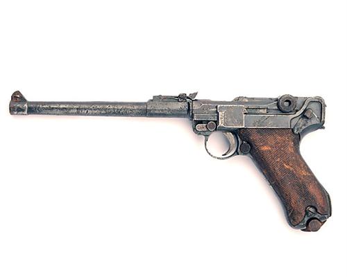 A 9mm (PARA) SEMI-AUTOMATIC SERVICE PISTOL SIGNED DWM, MODEL 'P08 LANGE 'ARTILLERY LUGER" serial no. 6236, with 8in. barrel sighted to 800 metres, receiver dated '1917', chequered wood grips, matching numbers throughout with the exception of the magazine (heel-plate replaced), finish worn with some surface pitting throughout