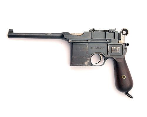 A 7.63mm SEMI-AUTOMATIC PISTOL SIGNED MAUSER, MODEL 'C96' LARGE RING HAMMER, serial no. 34245, for 1904, with 5 1/2in. barrel, long extractor, rear-sight calibrated from 50 to 1000 metres, left side of frame engraved 'DOLLMANN' within the milled panel, one plain wood grip and one chequered hard-rubber grip, refinished throughout, in matching number wooden stock holster (cracked, losses to top-section).