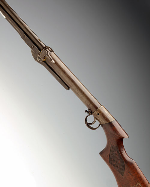 A .177 UNDER-LEVER AIR-RIFLE SIGNED BSA, MODEL 'LADIES OR LIGHT PATTERN', serial no. L6824?, circa 1920 (number indistinct), with 17in. barrel (rear-sight missing), plain air-chamber and saw-back pistol-grip butt-stock amateurly embellished with the name 'EDDY', push button under-lever, slight traces of finish