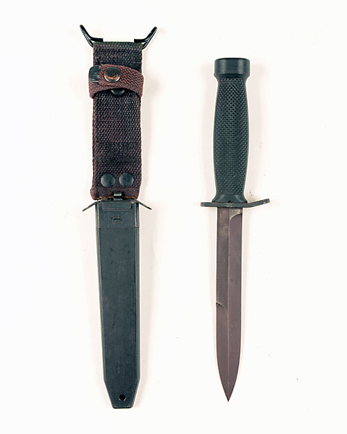 AN AMERICAN MILITARY KNIFE, with a 6 1/2 in. blade, chequer gripped handle complete with belt sheath
