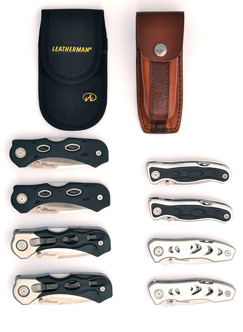 A COLLECTION OF EIGHT LEATHERMAN FOLDING KNIVES, including a Leatherman K500X Folding Knife with Black Nylon Sheath, a Leatherman K501X Folding Knife with Black Nylon Sheath, a Leatherman c302 Locking Liner Knife Plain Edge, a Leatherman c303 Locking Liner Knife Serrated Blade, a Leatherman E304X Straight Blade Folding Knife, a Leatherman E305X Serrated Blade Folding Knife , a Leatherman K502X Lockback Knife with Leather Sheath, a Leatherman K503X Lockback Knife with Leather Sheath, all complete with makers cartons