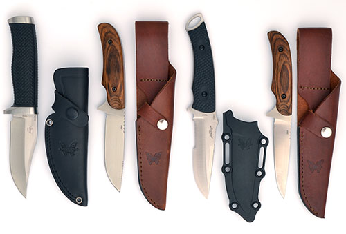FOUR BENCHMADE KNIVES, including a Benchmade Gamer Fecas Combo Edge knife with 4 in. steel blade , plastic sheath being complete with makers carton, a Benchmade 190 Drop Point Hunting Knife with a 3 1/2 in. steel blade and leather sheath complete with makers carton, a Benchmade 192 Bird & Trout Drop Point Hunting Knife with 4 in. steel blade and leather sheath complete with makers carton and a Benchmade Rant Bowie10500 with moulded grip pattern handle and leather sheath