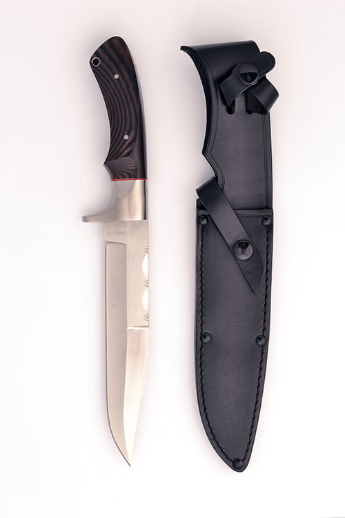 A MAGNUM BOKER GREAT WEST BOWIE KNIFE, with a 7 in. stainless steel blade and brown micarta scales on full tang, complete with leather sheath and original makers carton (1)