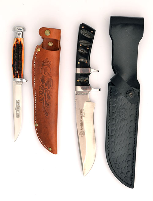 A SMITH & WESSON AND QUEEN CUTLERY KNIFE, including a Smith & Wesson Classic buffalo horn double hilted fixed blade knife with 6 in. blade, complete with black leather sheath and original makers carton TOGETHER with a Queen Cutlery deer hunter knife with a 4 in. blade and bone handle, complete with a brown leather sheath and original makers carton