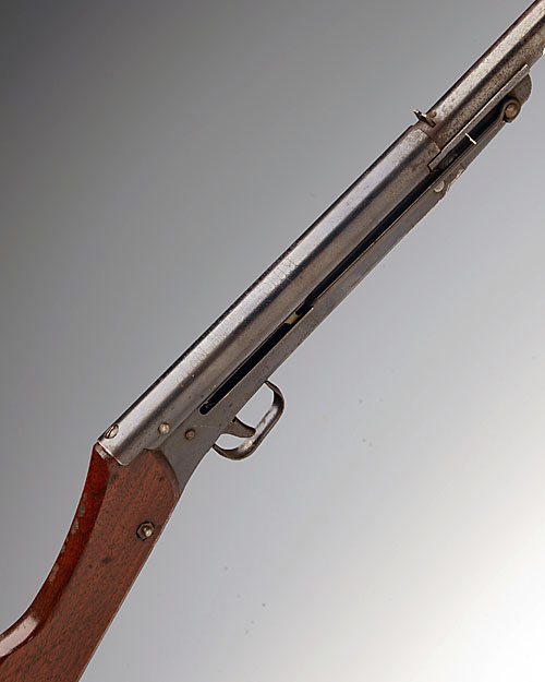 A .177 BREAK-BARREL TINPLATE AIR-RIFLE SIGNED KING, MODEL 17, no visible serial number, circa 1922, first model, with blued 12in. barrel, blued air-chamber and 'plank' type butt, good traces of original finish