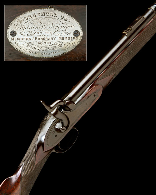 circa 1866, with 33in. rifled barrel, block and blade fore-sight with screw adjuster, base for ladder rear-sight (ladder missing), border-line engraved military style lock (mainspring at fault) signed 'J. ASTON, HYTHE', chequered walnut full-stock with exposed muzzle, the right hand side of butt inlaid with an oval border engraved silver plaque inscribed 'PRESENTED TO CAPTAIN H. STRINGER BY THE MEMBERS AND HONORARY MEMBERS OF THE 10TH C.P.R.V. JULY 28TH 1866', iron furniture including two barrel-bands and eyelets for sling, missing ramrod