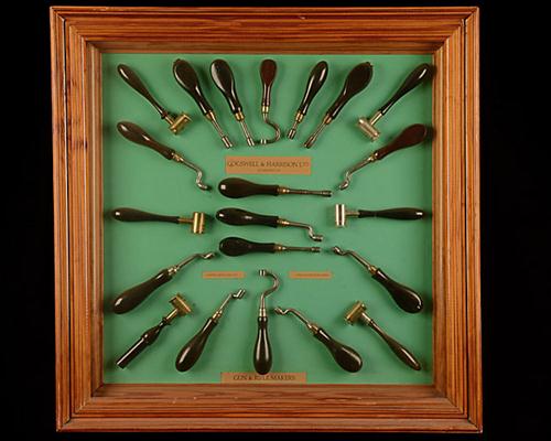 A GLAZED DISPLAY BOARD OF HAMMERGUN & RELOADING TOOLS, tools mounted on a green board, with 'COGSWELL & HARRISON', in the center, wooden frame m- measuring approx. 23in. x 23in.