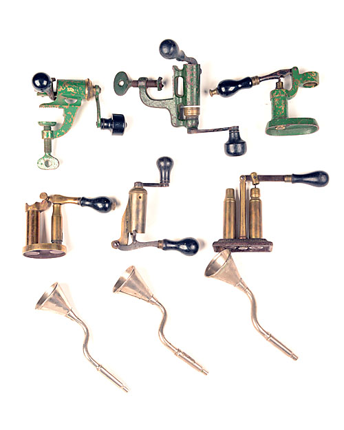 A COLLECTION OF VINTAGE RELOADING TOOLS, including roll-turnover tools, capper/de-capper, powder funnels