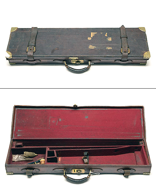 A BRASS-CORNERED SINGLE LEATHER GUNCASE, suitable for 28in. barrels, the interior lined with with maroon baize brass lock (key missing),