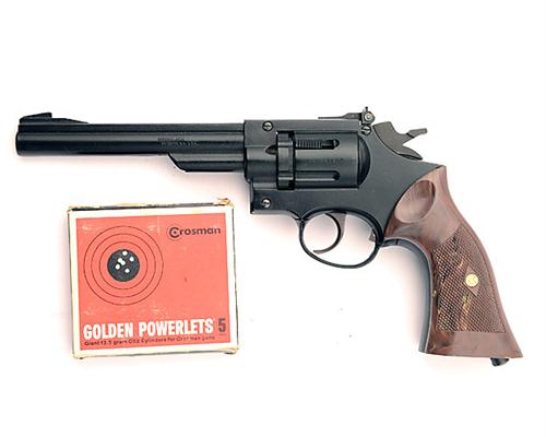 A BOXED .177 CO2-POWERED AIR-REVOLVER SIGNED CROSMAN, MODEL '38T', serial no. 117981174, circa 1980, with black painted finish, 6in. barrel and chequered brown plastic grips, complete with its manufacturers polystyrene and card carton (scuffed and torn lid), the gun appearing little used