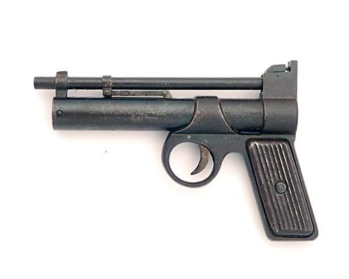 A .177 BARREL-COCKING SPRING-PISTON AIR-PISTOL SIGNED WEBLEY & SCOTT, MODEL 'JUNIOR', serial no. J24050, for 1939, with 6in. sighted barrel, plain air-chamber with 'Birmingham' address, iron frame with ribbed tin-plate grips, the whole with mild corrosion and some slight pitting