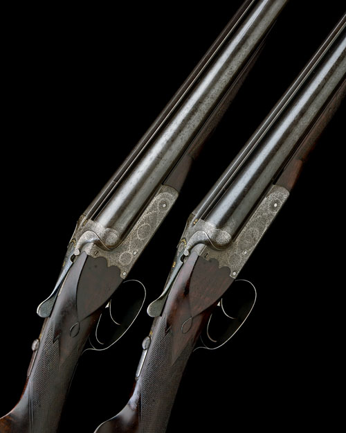28in. nitro reproved barrels (in 2013), the tubes engraved 'W.P. JONES. PATENTEE. 25. WHITTALL STREET. BIRMINGHAM. WINNER AT THE LONDON TRIALS OF 12 & 20 BORE GUNS LONDON.' and the ribs gold-inlaid '1' and '2' at the breech ends, 2 3/4in. chambers, bored approx. imp. cyl. and 1/4 (both), scroll-back treble-grip actions with sideclips, carved serpentine fences with scrolled termini engraved with a rose, the toplevers gold-inlaid '1', '2', and 'W.P. JONES', intercepting sears, automatic safeties with gold-inlaid 'S' details, bouquet and scroll engraving, the undersides with 'WPJ TRADE MARK', 13 1/2in. figured stocks, the fore-ends with some repairs, weight 6lb. 2oz. (No.1) 6lb. 4oz. (No.2)