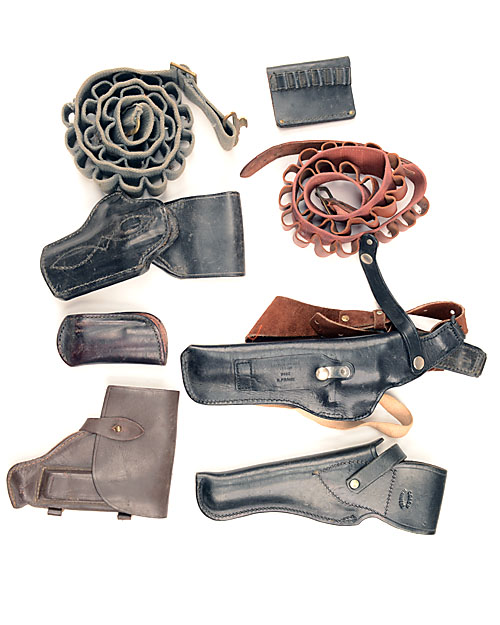 A LARGE MIXED BOX OF LEATHER HOLSTERS AND BELTS,