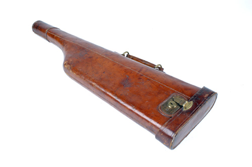 A LEATHER LEG-OF-MUTTON SINGLE GUNCASE, suitable for 30in. barrels, brass lock (key missing), the lid interior with a 'W.R. PAPE' trade label