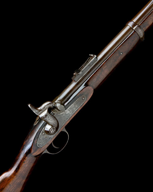 dated for 1863, with 31 3/4in. barrel signed 'I. HOLLIS & SONS, LONDON' (faint), block and blade fore-sight, elevating ladder rear-sight, plain military-type lock dated and signed 'ENFIELD' with a crown over 'V.R.' stamp to the tail and various inspectors marks, walnut full-stock with exposed muzzle (old working repair at wrist), iron furniture including three barrel-bands, the front with bayonet bar, and original iron ramrod with threaded end