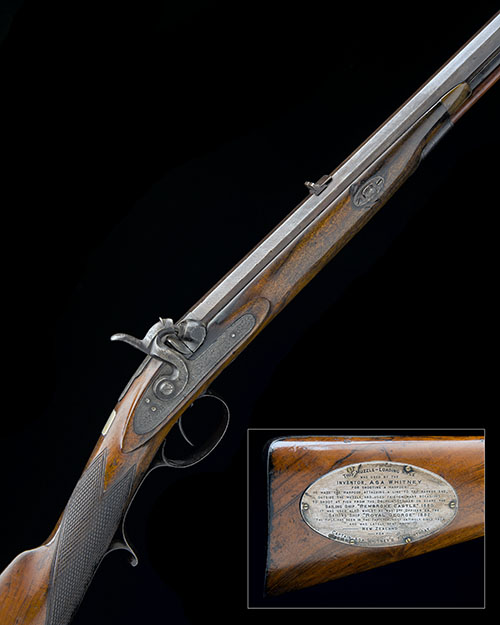circa 1850, with octagonal 31in. sighted barrel signed 'AGNEW, MAKER WELSHPOOL' (rubbed), small bar-action borderline and scroll engraved lock with further badly rubbed signature, walnut half-stock chequered at the wrist, spurred trigger-guard tang, set-trigger and brass-mounted wood ramrod, the right hand side of butt with large applied silver hallmarked oval plaque stating 'THIS MUZZLE-LOADING RIFLE WAS USED BY THE INVENTOR, ASA WHITNEY FOR SHOOTING A HARPOON. HE MADE THE HARPOON, ATTACHING A LINE TO THE BARBED END OUTSIDE THE MUZZLE, AND USED IT TO SHOOT AT FISH FROM THE DOLPHIN STRIKER ON BOARD THE SAILING SHIP 'PEMBROKE CASTLE' 1880. IT WAS USED ALSO WHILST HE WAS SECOND OFFICER ON THE SAILING SHIP 'ROYAL GEORGE' 1882. THE RIFLE HAS BEEN IN THE FAMILY ALMOST ENTIRELY SINCE THEN AND WAS LATELY SENT FROM NEW ZEALAND FOR CAPTAIN ASA WHITNEY'S 71ST BIRTHDAY.