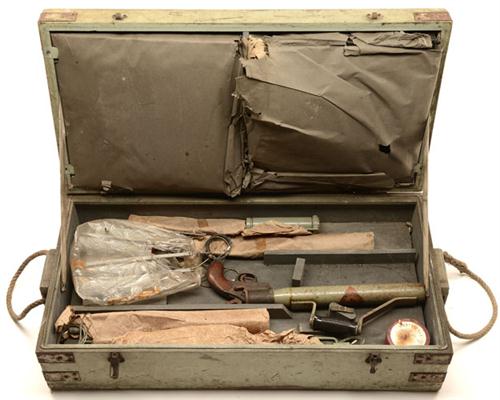 circa 1930, complete in its fitted wood case with various accessories and igniter cartridges, some damage through damp storage