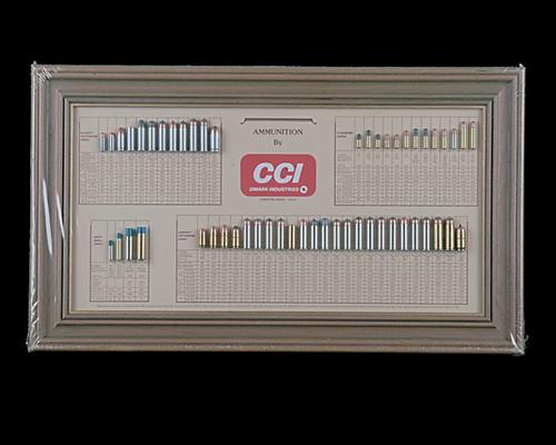 A CCI OMARK INDUSTRIES AMMUNITION DISPLAY BOARD, displaying various ammunition type including, Blazer centrefire Ammo, 22 Rimfire Ammo, Shot Shell Ammo and Lawman Centrefire Ammo, Measuring 23 1/2 in. x 14 in. overall in a wooden frame