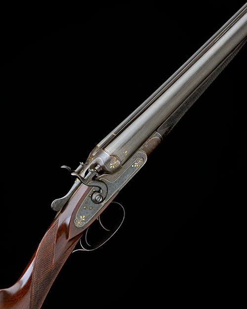 27 5/8in. (70cm) nitro reproved barrels (in 2014) with raised matt rib, twin gold-line details to the rib and tubes at the breech end, 2 1/2in. chambers, bored approx. 1/2 choke in both, treble-grip action with side-clips, carved percussion fences, unsigned rebounding sidelocks, the action, lockplates and furniture engraved with fine flowing floral motifs with gold-line and flower highlights, 14 3/8in. stock including wooden buttplate, weight 5lb. 14oz.