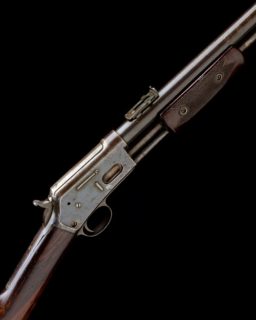 for 1891, with round 20in. barrel, block and blade fore-sight, elevating notch and ladder rear-sight, the top of barrel with makers details and patent dates, internal sliding bolt and external hammer, plain receiver with sprung loading gate on right hand side, saddle-ring mounted on left hand side, walnut butt-stock with iron semi-crescent butt-plate (crack at head of stock), under-barrel full-length magazine tube, sliding pump-handle with chequered walnut grips and fair traces of original finish