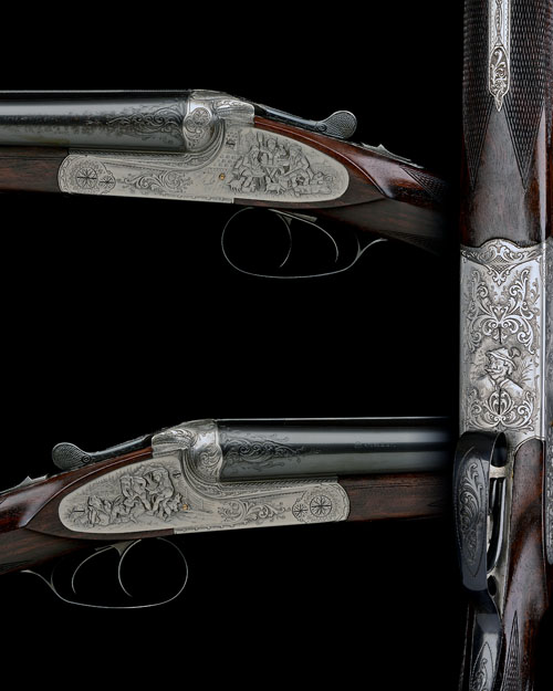 28in. 'Krupp Stahl' nitro barrels engraved with flashes of foliate scroll at the breech ends, 2 3/4in. chambers, bored approx. 1/2 and 3/4 choke, bolstered treble-grip action with sideclips, automatic safety, cocking indicator studs, engraved with acanthus scrollwork, the decorative sideplates carved with typical Bavarian scenes of daily life, the right with scenes of men working hard in the fields, the left with them enjoying the hospitality of a Beer Hall and signed 'O. Weiss', the underside with a portrait of a behatted Bavarian, bright finish, 14 1/4in. pistolgrip stock with pistolgrip cap, cheekpiece, including buttplate, weight 6lb. 13oz.