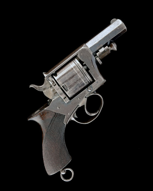 circa 1870, with blued octagonal 3in. barrel, the top-strap signed 'TIPPING & LAWDEN, LONDON, crescent fore-sight, standing notch rear-sight, plain cylinder with rope-border carving to the leading edge, plain solid frame with hinged loading gate, wing-nut hammer safety, one-piece chequered walnut saw-grip butt, iron pommel with lanyard ring and centrally mounted ejector rod, the whole retaining fair traces of original finish