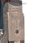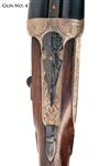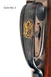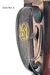 27in. nitro chopperlump barrels, raised matt ribs gold-inlaid '3' and '4', 2 3/4in. chambers, bored approx. imp. cyl. and 1/4 choke, treble-grip actions with hidden third bites, side-clips, removable striker discs, toplevers gold-inlaid '3' and '4', automatic safeties, hand-detachable lockplates, gold-inlaid cocking-indicators, Holland & Holland style self-opening systems, articulated front triggers, rolled-edge triggerguards, bold stylised floral and scroll engraving with pheasant and duck, the triggerguards gold-inlaid with an 'F.M.' monogram, bright and blued finish overall, 14 3/4in. stocks, weight 5lb. 13oz.