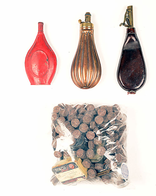 A COLLECTION OF MUZZLE LOADING EQUIPMENT, including wads, percussion caps, shot, wad cutter, brass percussion cap dispenser, 2 x shot flasks, reproduction powder flask, flint stone with instructions for use