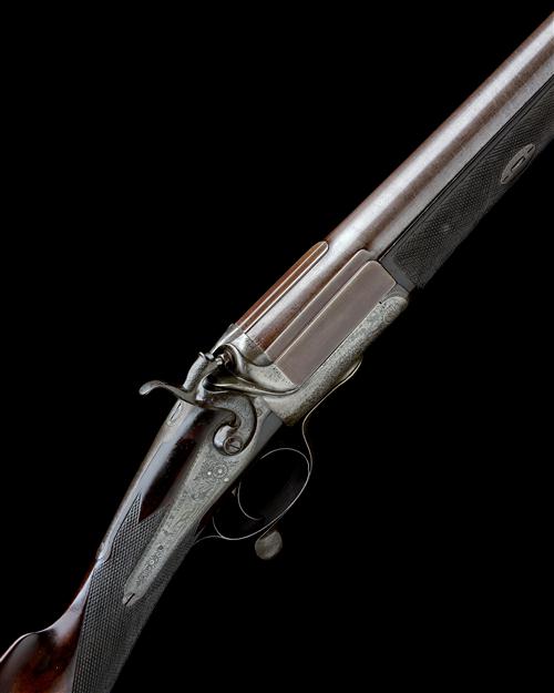 30in. nitro reproved fine damascus barrel with short sight rib, 3in. chamber, bored approx. true cyl., Jones patent rotary-underlever, carved percussion fence, rebounding back-action lock, border and scroll engraving, the lock with a brace of pheasant, 14 1/8in. well-figured stock including steel buttplate, fore-end with fluted horn finial, weight 7lb. 6oz.
