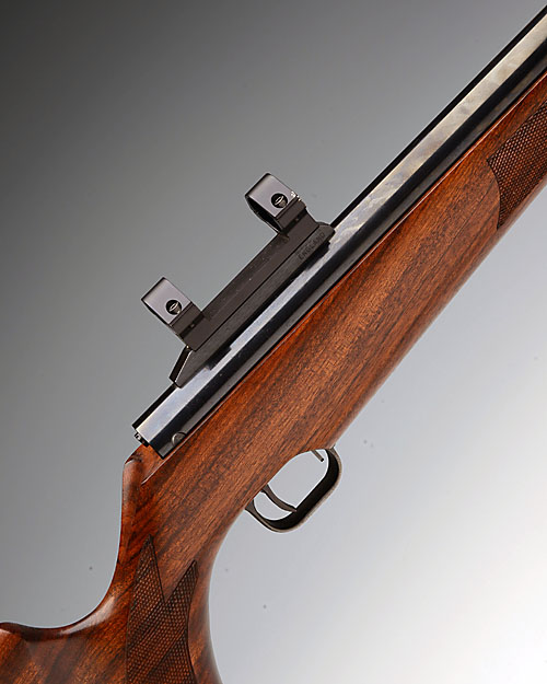 A .22 (OVER 12FTLBS) BREAK-BARREL GAS-RAM AIR-RIFLE SIGNED THEOBEN, MODEL 'ELIMINATOR', serial no. TB18678, earlier pre 'HE' system with 22 1/4in. barrel including built-on sound-moderator, blued air-chamber with integral telescopic sight mount and walnut chequered ambidextrous stock